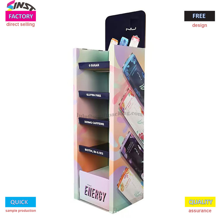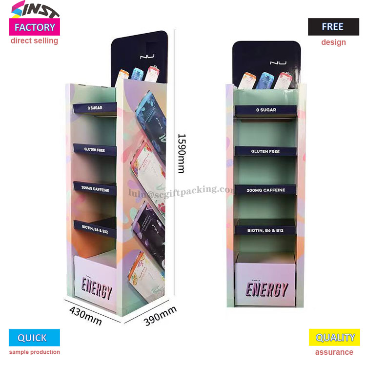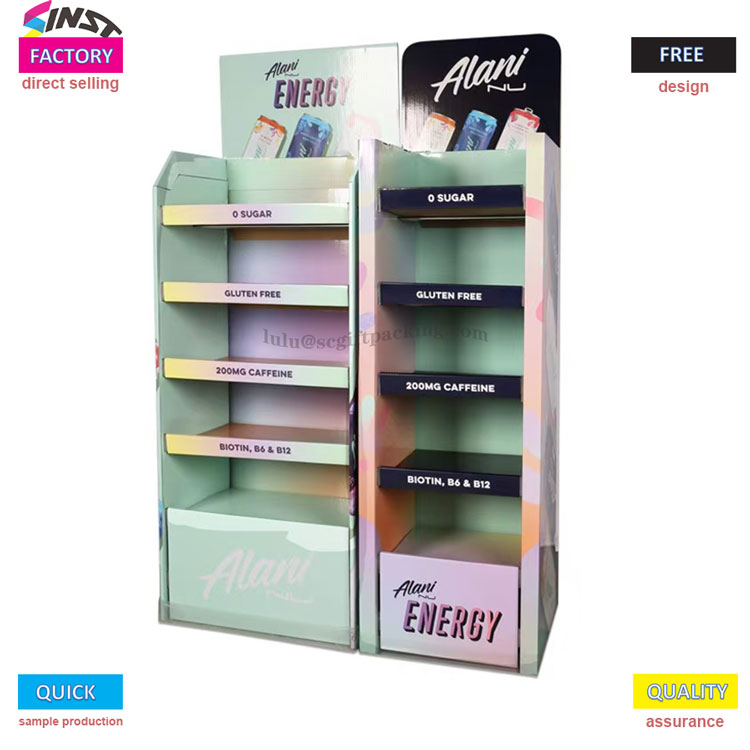 Приказ сталак је направљен од дебеле картонске картоне, са водоотпорним премазом на површини. Капљици воде на боцама за пиће су се осуше чим се бришу, и не боји се деформације чак ни у влажним окружењима. Материјал је 100% рециклиран, еколошки прихватљивији од пластичних заграда и може се поново користити више пута, помагање предузећима да штеде дугорочне трошкове. Држач има снажан носивост и може стабилно задржати 10 боца енергетске соде без тресења, пружајући снажан осећај сигурности!