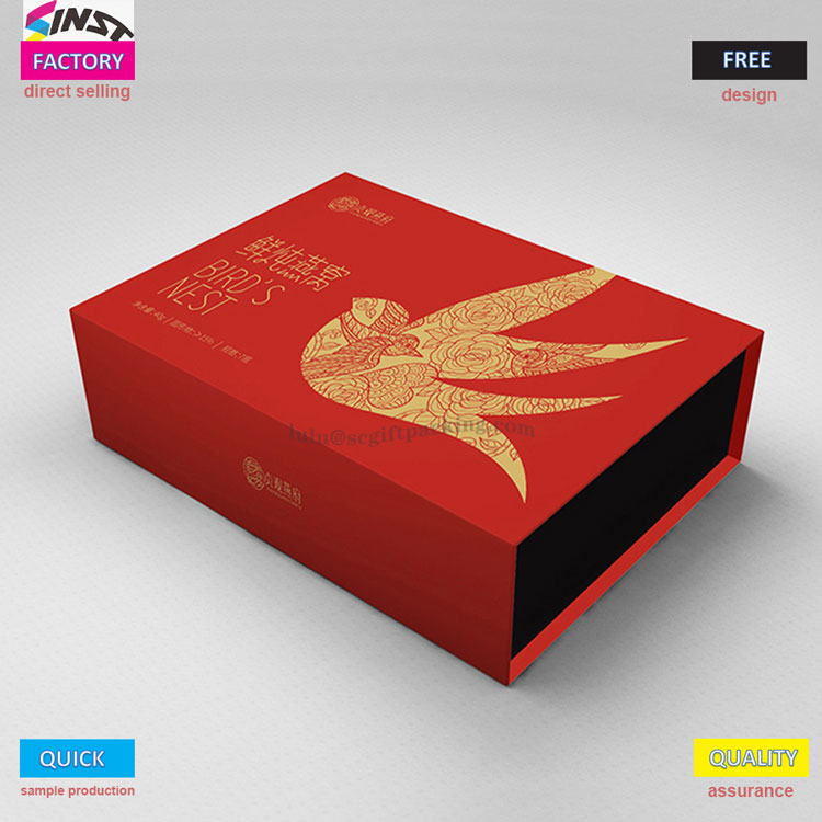 Овај хигх-енд здравствени производ БИРД ГНДС ФЛИП ЦОВЕР ЦОПЕ поклон се заснива на луксузној подударању црвене и црне боје. Спољна кутија је направљена од крути картона са магнетним отварањем и затварањем дизајна. Када се кутија отвори, присутна је унутрашња унутрашња прецизна пенаста облога. Шест независних партиција прецизно се брине за сваку боцу спремног за јело гнездо птица, која има и визуелну лепоту и практичну заштиту. Било да се продаје у тржном центру или давање поклонима породици и пријатељима да изразе своја осећања, сви показују стил.