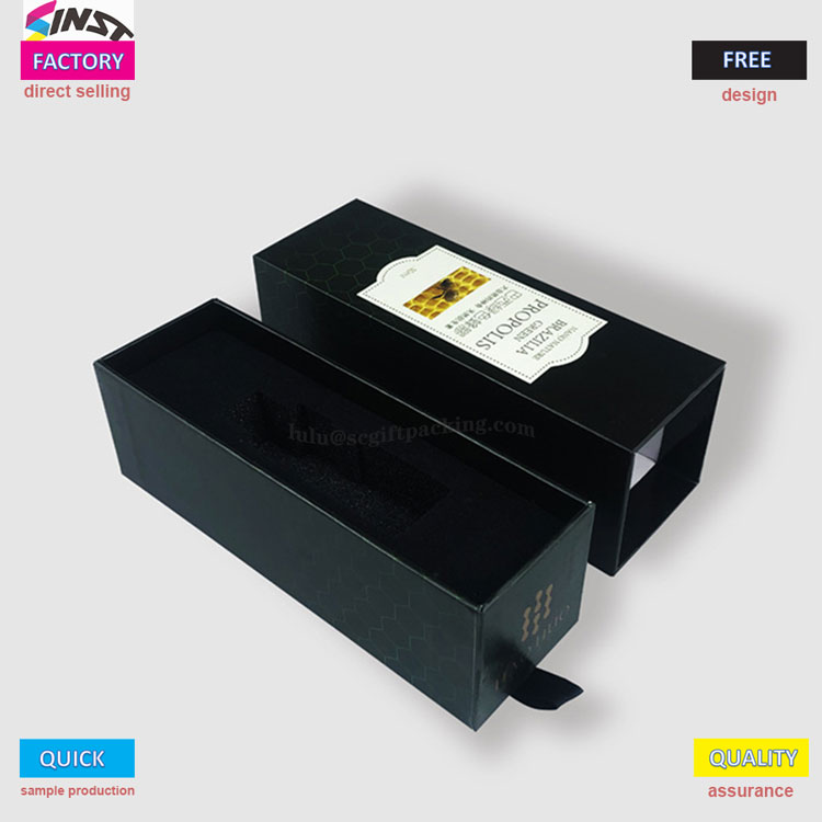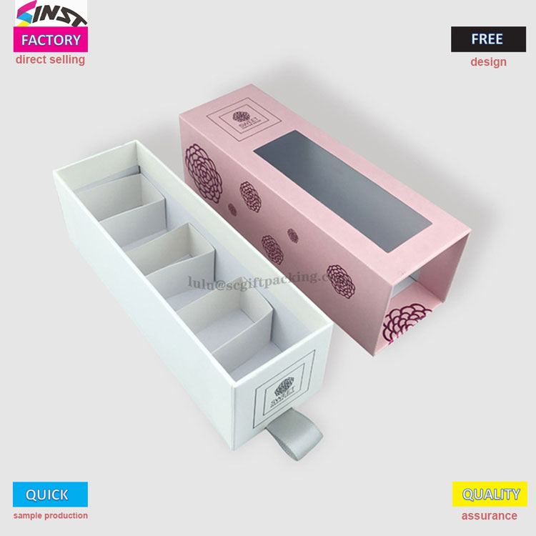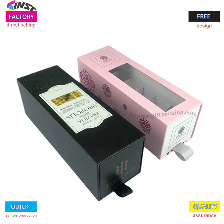 Овај луксузни крути ладица Клизни поклон кутија за паковање за есенцијално уље садржи претинизовани дизајн и прозирни прозори који омогућавају јасну видљивост четири одељка унутар кутије без потребе за отварањем поклопца; Када се црно-ружичасти двоструки оквири поставе раме уз раме, домишљатост дизајна се може видети: црна кутија има златна слова украшена тијелом за текстуриранији изглед, а црни прстен за вучу са стране се лако може лако извући; Ружичасти модел задржава провидан прозор који може директно видети посебан резервоар за суштински узорак - суђење лосион, 10 мл суштина је чврсто умотана. Од узорака суштине на алате, подела је јасна и неизмерена.