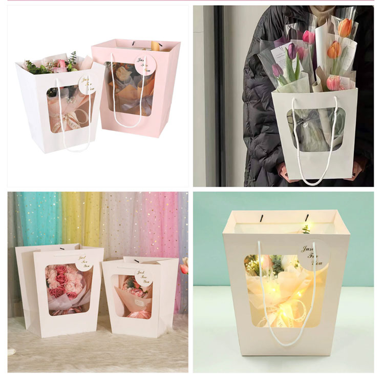 Торба за прозор Букет. Поклонске кесе су контејнери који се користе за складиштење и паковање поклона. Главни материјали укључују неткану тканину, папир, памучни платни платни платни платни, итд. Због разматрања заштите животне средине, природа се може рециклирати торби за паковање папира постала је нова фаворита у индустрији паковања. Прозорска одскочна торба се односи на отварање прозора у простору за паковање и заптивање га прозирним ПВЦ-ом да би се приказао најбољи део производа. Овај образац за дизајн може побољшати аутентичност и транспарентност производа, омогућавајући потрошачима да имају јасно разумевање самог производа, а такође одражавају самопоуздање самог самог производа.