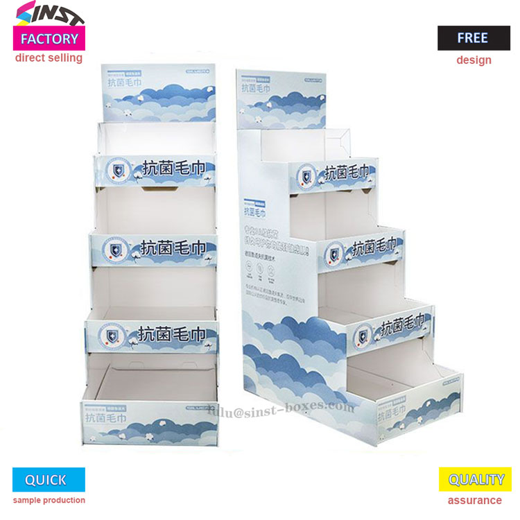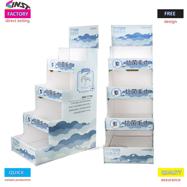 Овај картонски сталак за пешкире је посебно прилагођен за категорију пешкира, са чисто белом подлогом и плавим и белим облацима и малим цветним принтовима одштампаним на њему, пружајући освежавајући осећај који савршено одговара основним атрибутима пешкира, који су „пријатељски и чисти за кожу“; Степенаста трослојна структура са независним простором за складиштење, омогућава лако сортирање и постављање марамица, пешкира за лице и преносивих предмета за лак приступ.